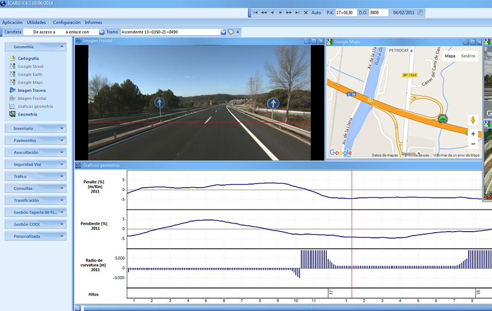 ICARO muestra, de forma gráfica y numérica, los datos geométricos de peralte, pendiente y radio de curvatura, datos obtenidos por equipos de alto rendimiento con sistema inercial incorporado.