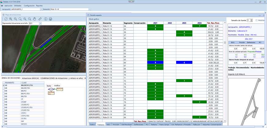 Los parámetros estructurales y funcionales de los pavimentos, recogidos mediante dispositivos de alto de alto rendimiento o visualmente, se cargan en el sistema. Estos datos se visualizan mediante gráficos, histogramas, temáticas y tablas. Además, pueden visualizarse distintos parámetros técnicos (PCN. PCI, etc.) pueden representarse. Además, DEDALO calcula automáticamente el PCI a partir de los datos recogidos.