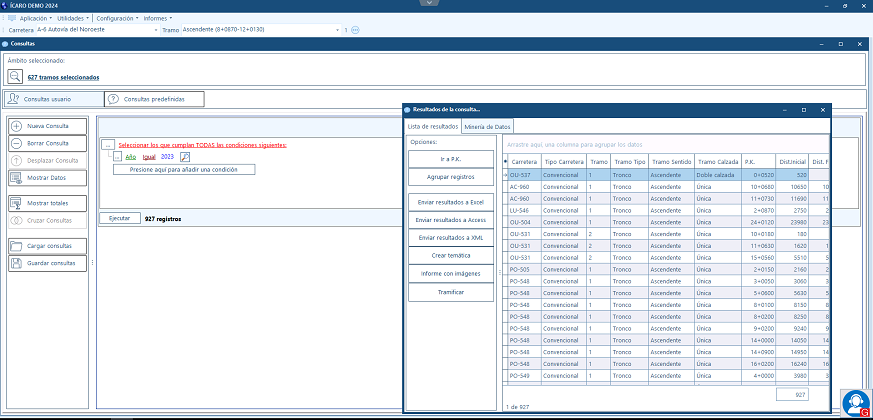 Se pueden consultar los datos existentes en el sistema, procedentes de cualquier módulo o disciplina. La utilidad principal de esta herramienta es su capacidad para cruzar información de diversas áreas. De una forma sencilla y rápida, se posibilita la obtención de información concreta. Además, los datos obtenidos se pueden representar en tablas y temáticas.