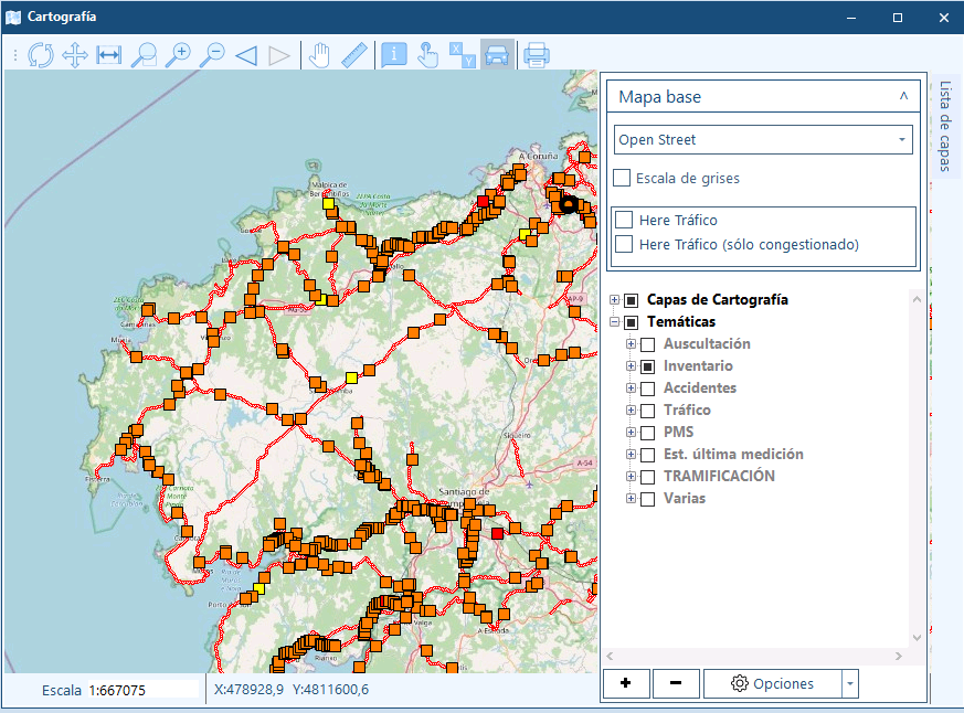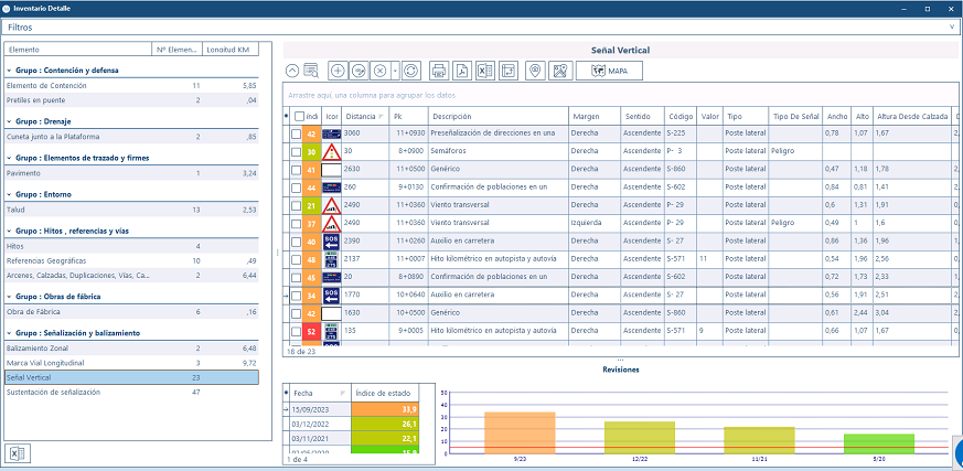 Contiene el inventario de todos los elementos de la red: marcas viales, señalización vertical, equipamiento, entorno, hitos, estructuras… ubicados en las carreteras. Cada uno de ellos cuenta con una ficha personalizada, que registra sus características: localización, estado, históricos de revisiones y actuaciones realizadas.