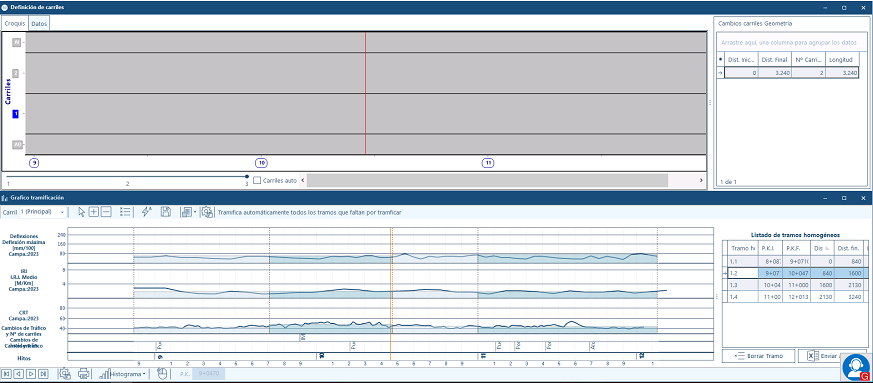Este módulo segmenta automáticamente las carreteras en tramos de comportamiento homogéneo. Cada uno de ellos quedará caracterizado por valores estadísticos de auscultación, de manera que puedan ser analizados mediante la Gestión Experta de Firmes.